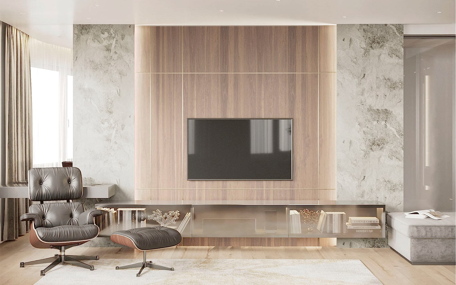 Особенность этого объекта- спроектированные застройщиком маленькие технические помещения. Прихожую мы решили расширить огромным зеркалом во всю стену. А в ванных комнатах использовали преимущественно светлый керамогранит. Уделили особое внимание спальной комнате. Обычно в спальной работают с изголовьем. Для нас стал важен глянцевый эффект зеркал в соседстве со стеклом. Нужно было снова расширять помещение. А деревянные Pin-Up разорвали границу с гардеробом, продолжаясь на стене с гардеробом.