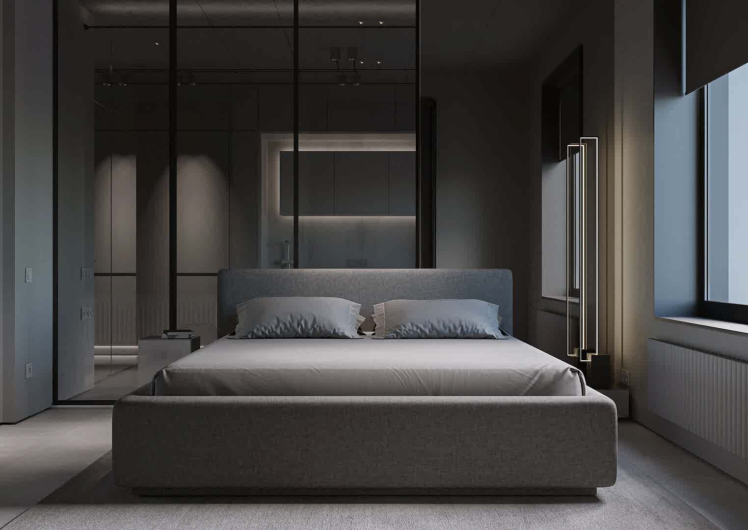 Это спальная. Также прекрасна, как остальная часть квартиры. Утонченный прямоугольный светильник, подходящий под Pin-Up интерьера. Квадратная и обязательно мягкая обивка кровати.